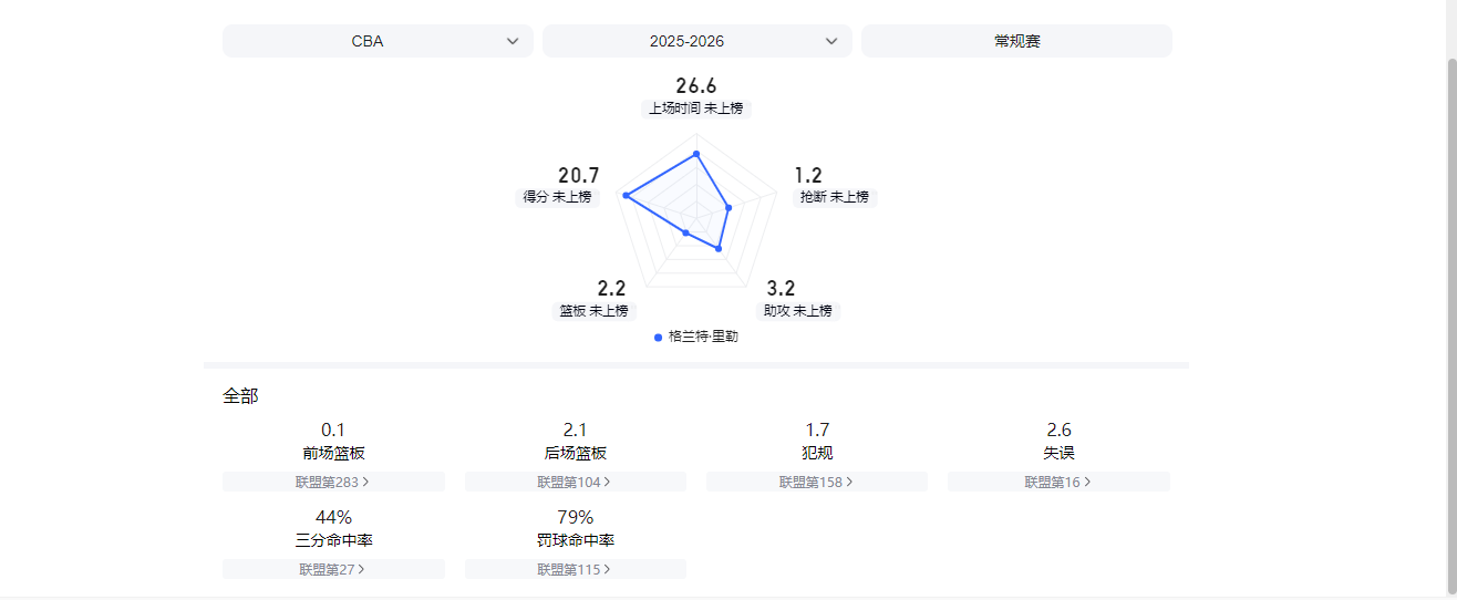 另外,球风稳健,核心力量突出的进攻万花筒里勒,场均还能为球队贡献20.7分2.2篮板3.2助攻。